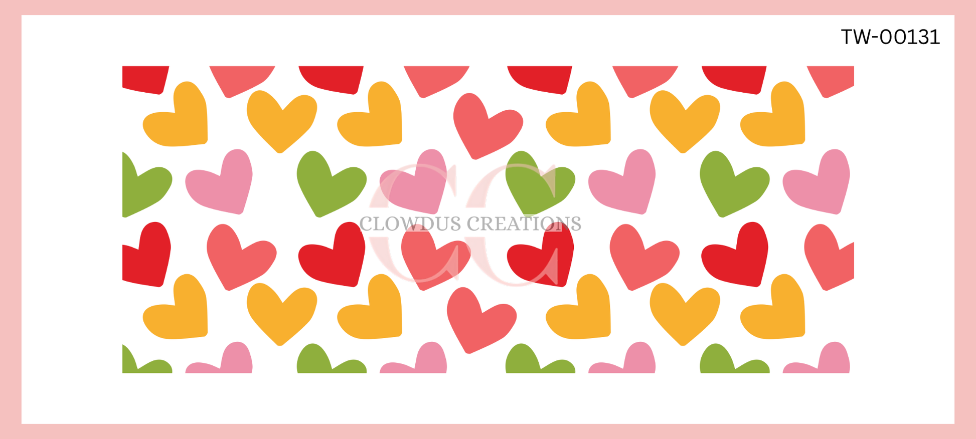 Colorful Hearts UV DTF Wrap TW-00131 features a vibrant heart design in multiple colors. Made with UV Direct to Film technology, it offers bright, lasting colors and clear details. This durable wrap is perfect for adding a lively and cheerful touch to your items.