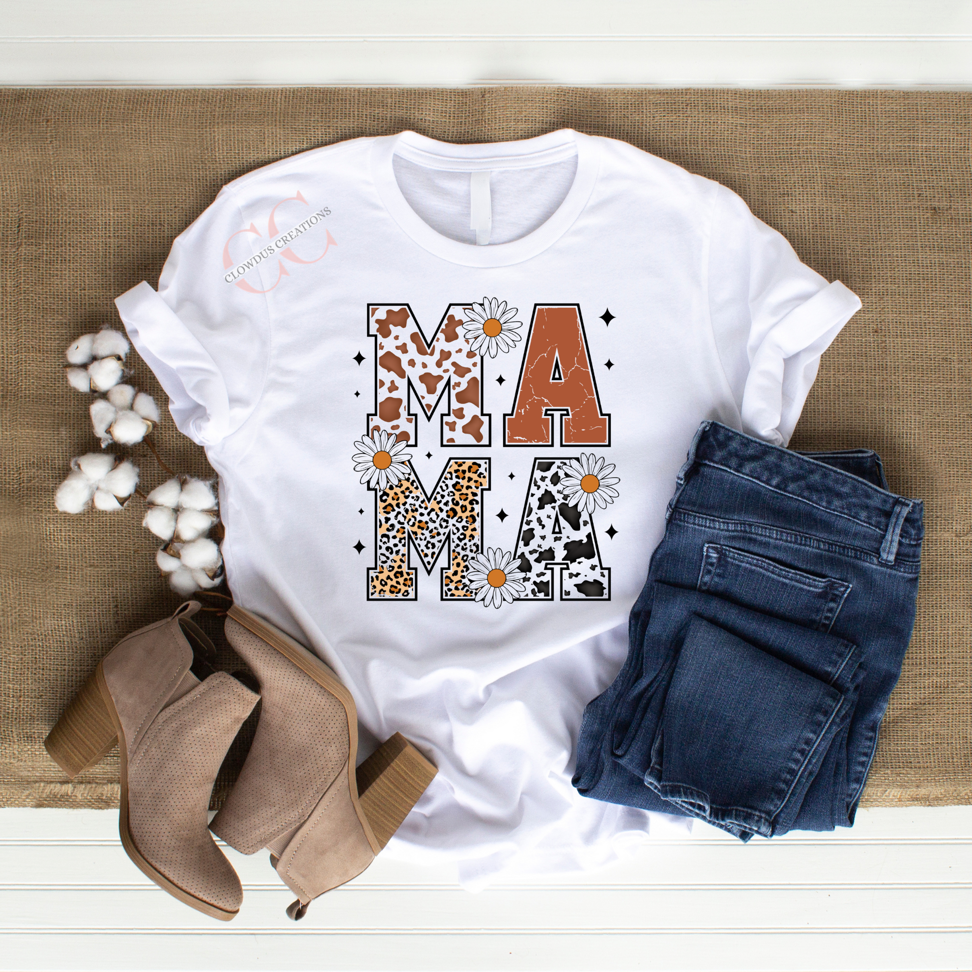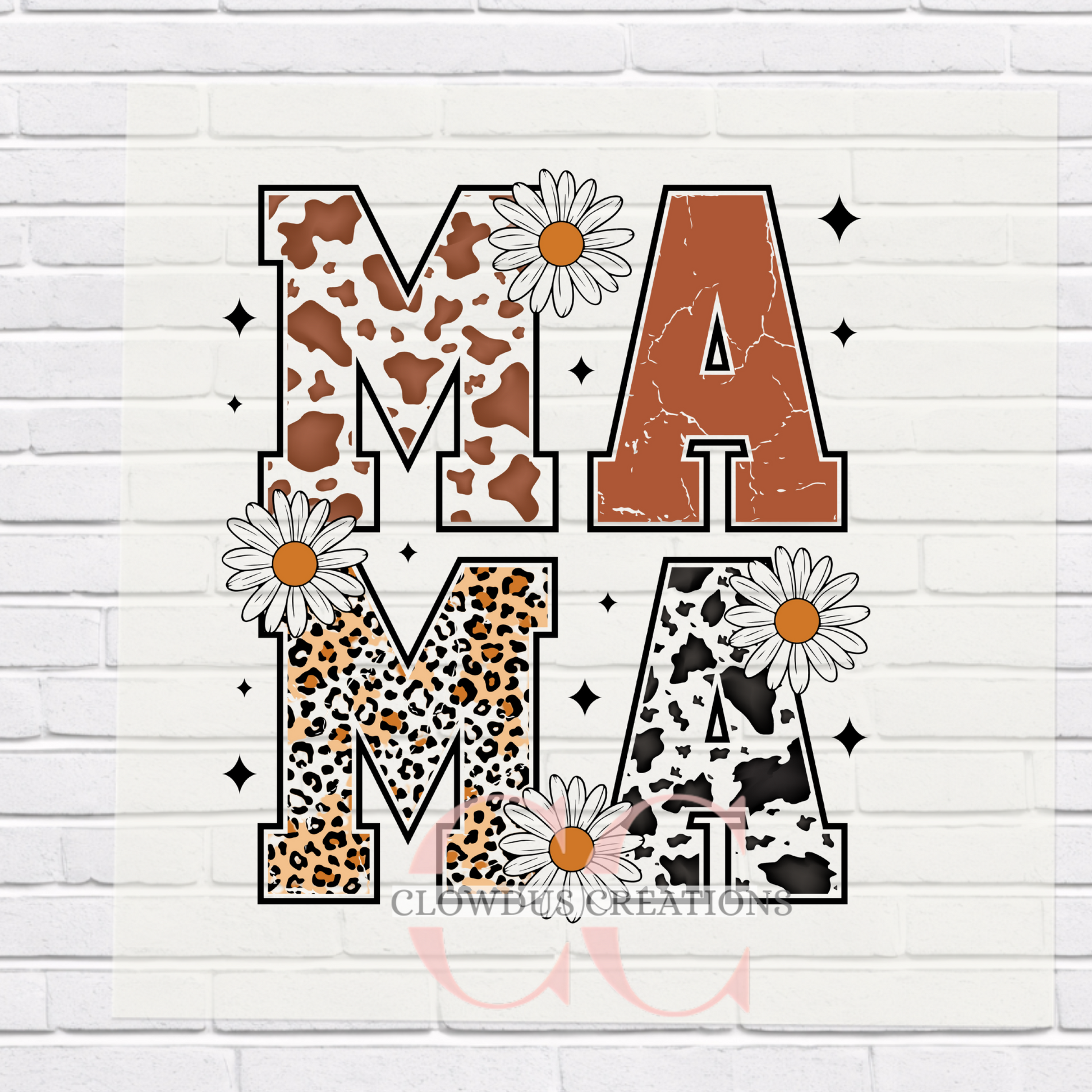 Unleash your inner wild side with this fierce and fabulous “MAMA” Direct-to-Film transfer! Featuring four bold letters in a mix of cow print, cracked terracotta, leopard print, and black marble – all accented with retro-style daisies – this design is perfect for mamas who love a little rustic glam and western flair.